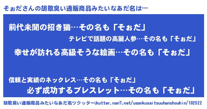 | 男性向けラノベタイトル風あだ名 | 『緋弾のソォダ』『そぉだの憂鬱』 |