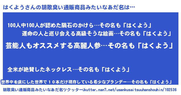 | 男性向けラノベタイトル風あだ名 | 『Re:はくようから始める異世界生活』 |