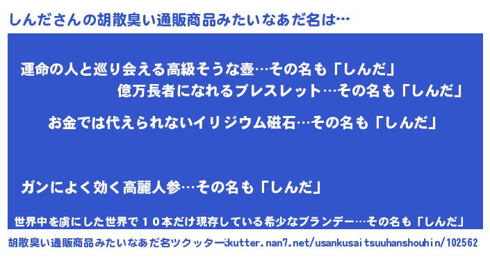| 男性向けラノベタイトル風あだ名 | 『転生したらしんだだった件』 |