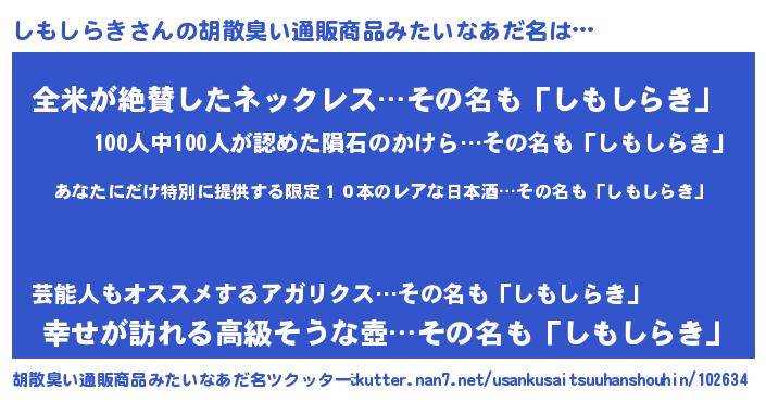 | 意味不明あだ名 | 『住所不定無職しもしらき(62歳)』 |