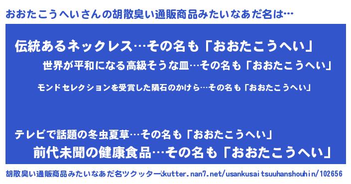 | 男性向けラノベタイトル風あだ名 | 『ノーゲーム・ノーオオタコウヘイ』 |