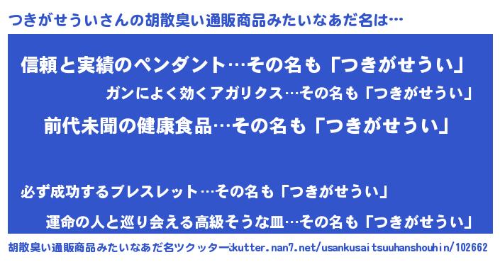 | 男性向けラノベタイトル風あだ名 | 『つきがせうい~年齢イコール彼女いない歴の魔法使い~』 |