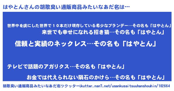 | 意味不明あだ名 | 『とにかく怪しいはやとん』 |
