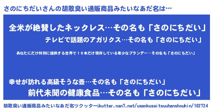 | 意味不明あだ名 | 『住所不定無職さのにちだい(79歳)』 |