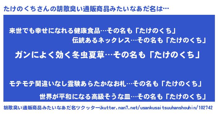 | 男性向けラノベタイトル風あだ名 | 『はたらくたけのくちさま!』 |