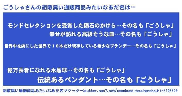 | 男性向けラノベタイトル風あだ名 | 『この素晴らしい世界にごうしゃを!』 |