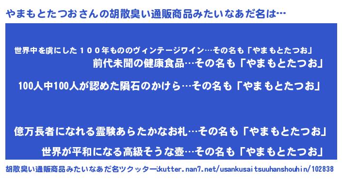 | 男性向けラノベタイトル風あだ名 | 『おまえをオタクにしてやるから、俺をやまもとたつおにしてくれ! 』 |