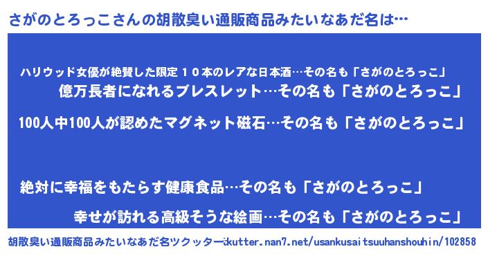 | 男性向けラノベタイトル風あだ名 | 『おまえをオタクにしてやるから、俺をさがのとろっこにしてくれ! 』 |