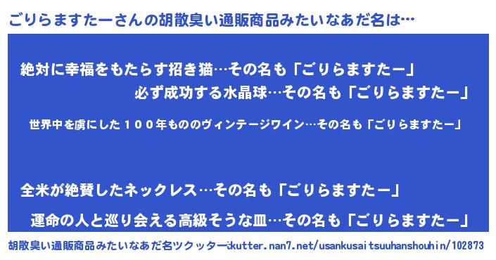 | 伝説のあだ名 | 『古より伝わる吟遊詩人ごりらますたー』 |