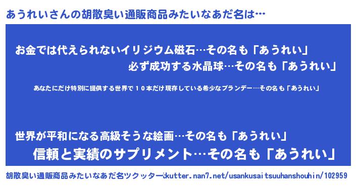 | 男性向けラノベタイトル風あだ名 | 『この素晴らしい世界にあうれいを!』 |