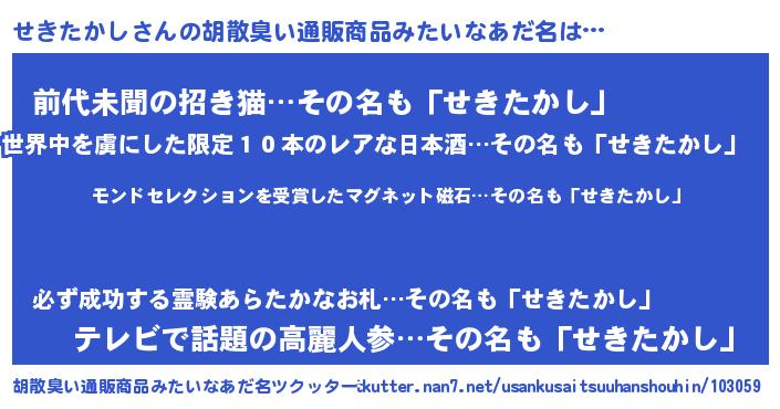 | ヘコむあだ名 | 『せきたかし(笑)』『せきにゅー』 |