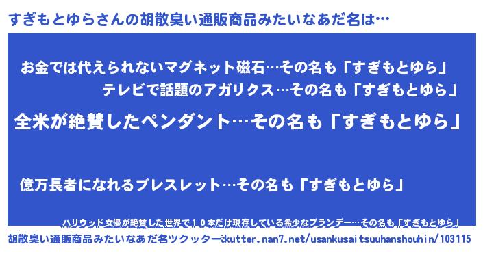 | 男性向けラノベタイトル風あだ名 | 『すぎもとゆら~年齢イコール彼女いない歴の魔法使い~』 |