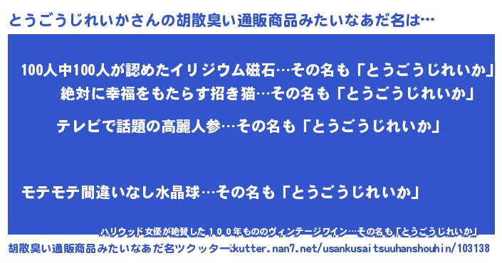| ヘコむあだ名 | 『とうごうじれいか(笑)』『とうにー』 |