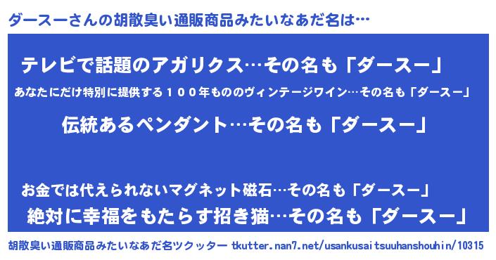 | 男性向けラノベタイトル風あだ名 | 『転生したらダースーだった件』 |