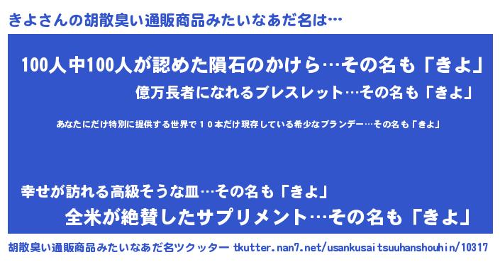| 男性向けラノベタイトル風あだ名 | 『この素晴らしい世界にきよを!』 |