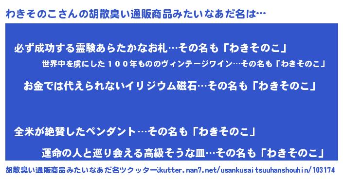 | 男性向けラノベタイトル風あだ名 | 『転生したらわきそのこだった件』 |