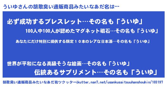 | 男性向けラノベタイトル風あだ名 | 『この素晴らしい世界にういゆを!』 |