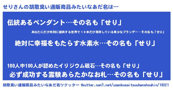| ヘコむあだ名 | 『せり(震え声)』『せりぷりん』 |