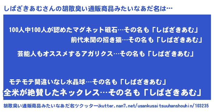 | 男性向けラノベタイトル風あだ名 | 『Re:しばざきあむから始める異世界生活』 |