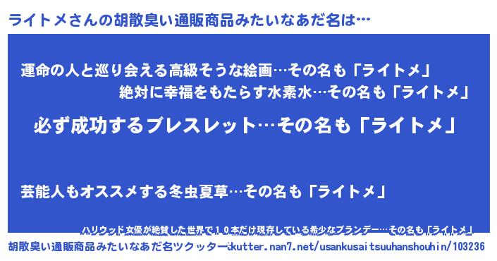 | 意味不明あだ名 | 『ペロリンライトメ』『永久保存ライトメ』 |