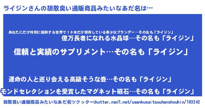 | 男性向けラノベタイトル風あだ名 | 『ダンジョンにライジンを求めるのは間違っているだろうか』 |