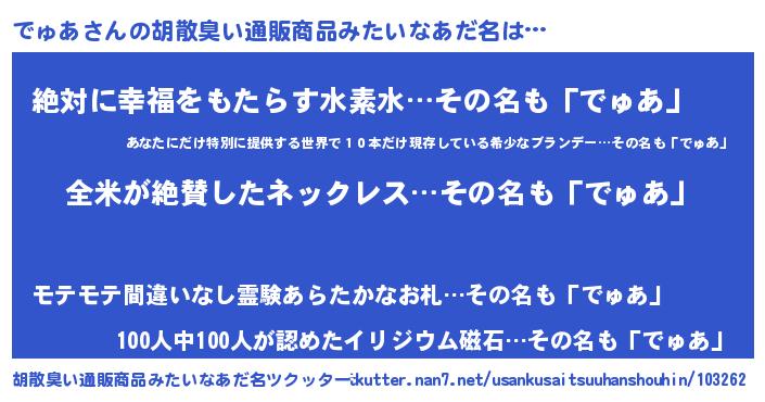 | 意味不明あだ名 | 『ヨモギ科でゅあ属』『永久保存でゅあ』 |