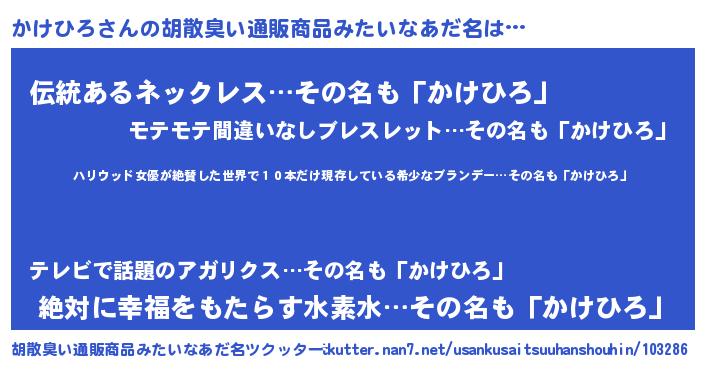 | 意味不明あだ名 | 『住所不定無職かけひろ(91歳)』 |