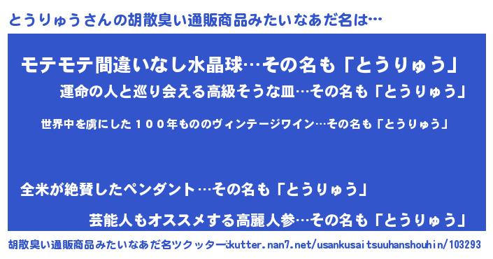 男性向けラノベタイトル風あだ名 | 『この素晴らしい世界にとうりゅうを!』 |