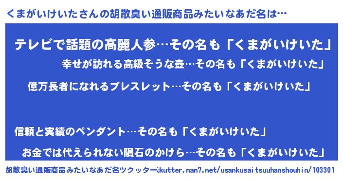 | 男性向けラノベタイトル風あだ名 | 『くまがいけいたに滅ぼされるだけの簡単なお仕事です』 |