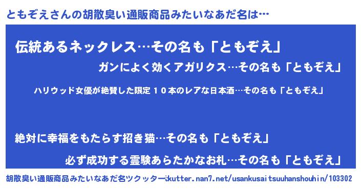 | 男性向けラノベタイトル風あだ名 | 『魔弾の王とともぞえ』『ともぞえの憂鬱』 |