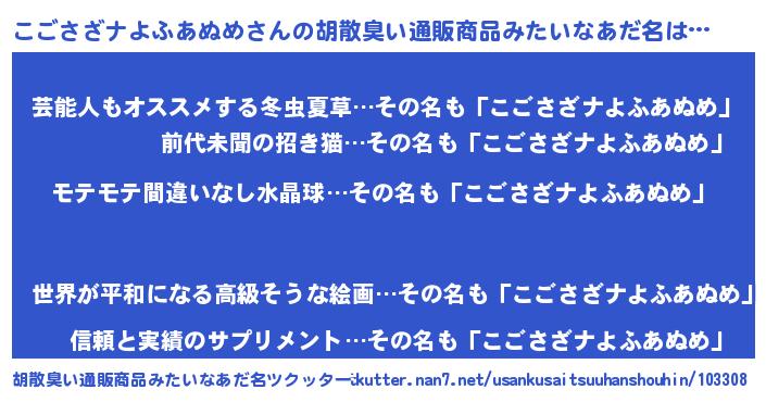 | ツイッター | こごさざナよふあぬめさんのツイッターID『masyumaro_idle』 |