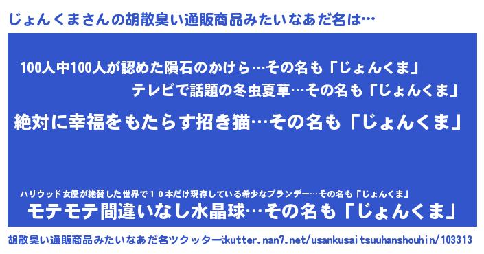 | 男性向けラノベタイトル風あだ名 | 『じょんくまという概念が存在しない退屈な世界 』 |