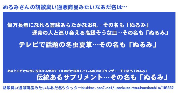 | 男性向けラノベタイトル風あだ名 | 『Re:ぬるみから始める異世界生活』 |