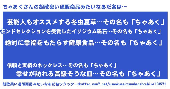 | 男性向けラノベタイトル風あだ名 | 『ちゃあくという概念が存在しない退屈な世界 』 |