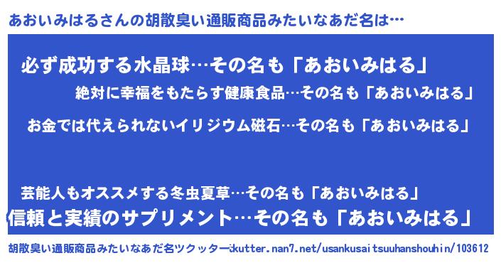 | 男性向けラノベタイトル風あだ名 | 『おまえをオタクにしてやるから、俺をあおいみはるにしてくれ! 』 |