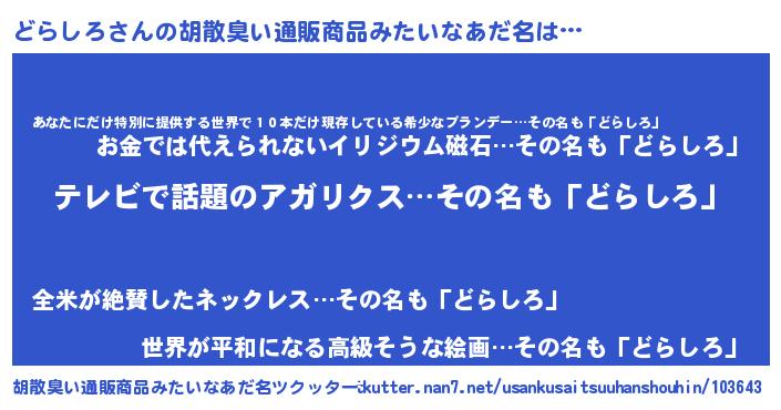 | 男性向けラノベタイトル風あだ名 | 『Re:どらしろから始める異世界生活』 |