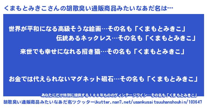 | 女子向けラノベタイトル風あだ名 | 『くまもとみきこの契約王妃』 |