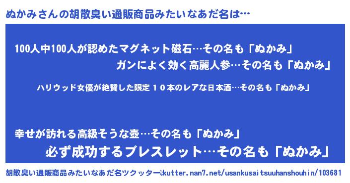 | ヘコむあだ名 | 『ぬかにゅー』『つくし』『ぬかを』 |