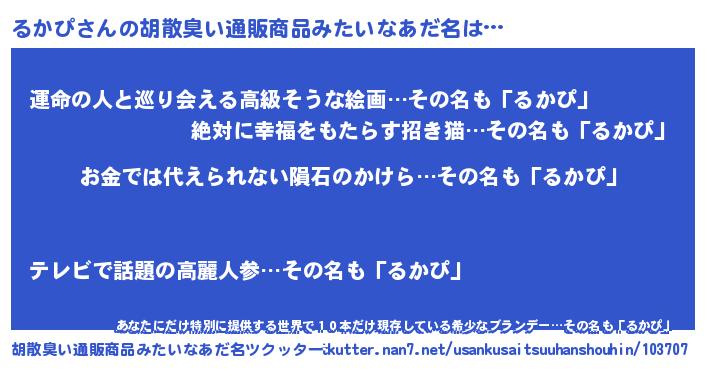 | ヘコむあだ名 | 『豆乳』『るかぴ(小並感)』『るかを』 |