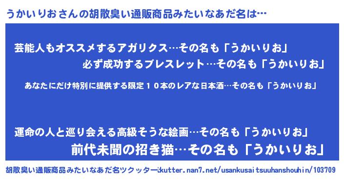 | 男性向けラノベタイトル風あだ名 | 『この素晴らしい世界にうかいりおを!』 |