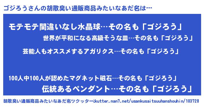 | 男性向けラノベタイトル風あだ名 | 『うちのゴジろうが世界を掌握している!』 |