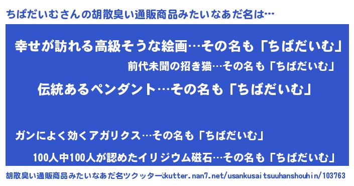 | 男性向けラノベタイトル風あだ名 | 『ちばだいむの嫁は女の子じゃないと思った?』 |