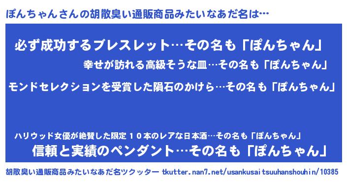 | ヒーロー風カッコイイあだ名 | 『慈愛の使者ぽんちゃん』『暗黒騎士ポン』 |
