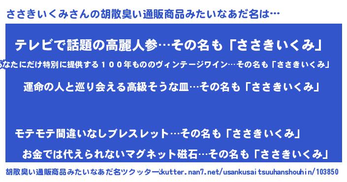 | 男性向けラノベタイトル風あだ名 | 『ささきいくみ~年齢イコール彼女いない歴の魔法使い~』 |