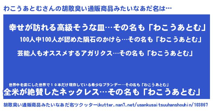 | 男性向けラノベタイトル風あだ名 | 『わこうあとむに滅ぼされるだけの簡単なお仕事です』 |