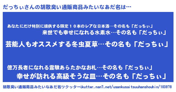| 男性向けラノベタイトル風あだ名 | 『だっちぃに滅ぼされるだけの簡単なお仕事です』 |
