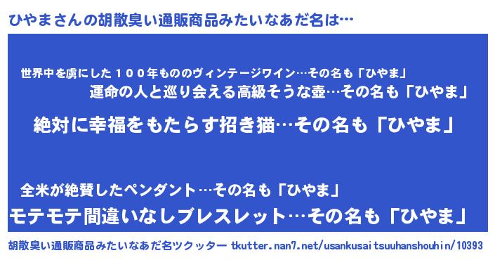 | 男性向けラノベタイトル風あだ名 | 『ひやまという概念が存在しない退屈な世界 』 |