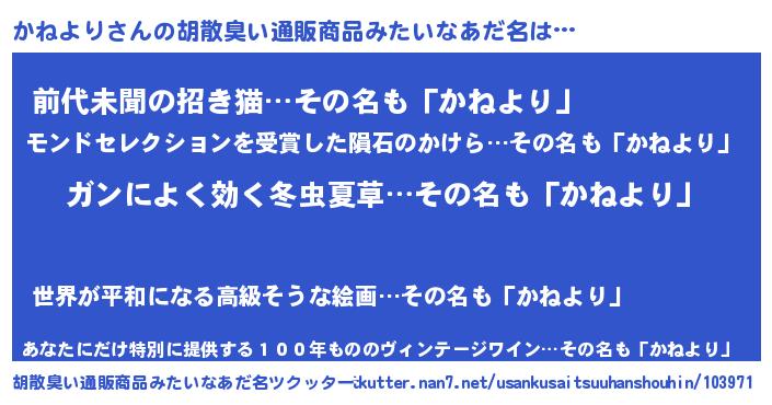 | 意味不明あだ名 | 『自称かねより』『永久保存かねより』 |