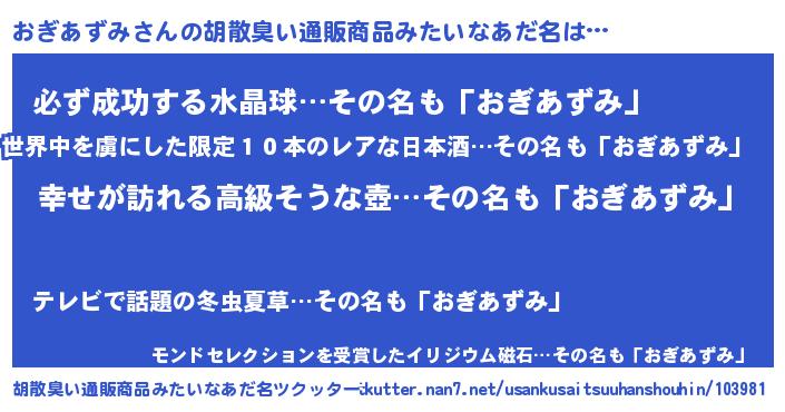 | 女子向けラノベタイトル風あだ名 | 『おぎあずみの雑貨屋さん』 |