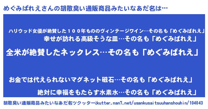 | 欧米人風あだ名 | 『ウサインめぐみばれえ』 |